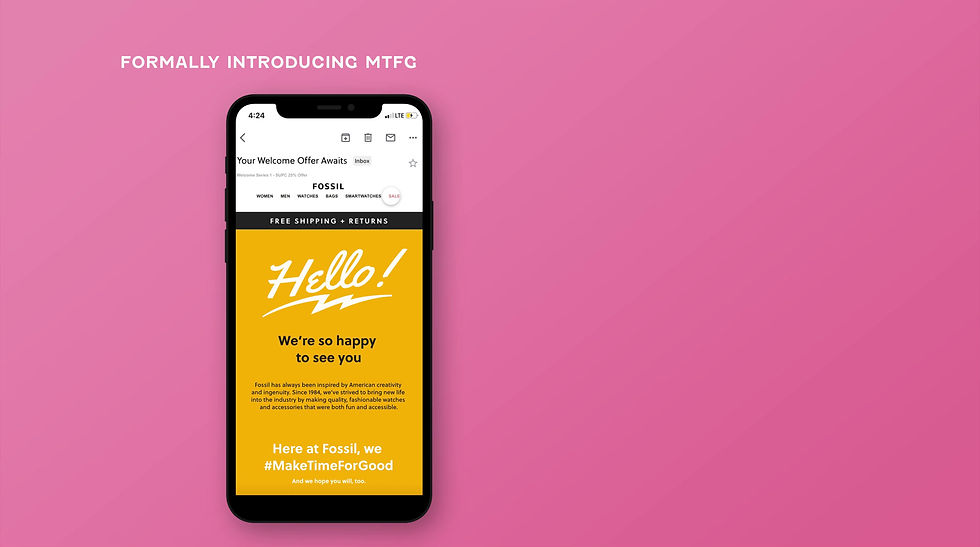 The Fossil Creative Dept. tasks their interns with a self-directed intern project, working to develop a marketing campaign directed towards Gen Z that lives across at least two channels, adhering to Fossil's authentic style. For this project, I created an omnichannel campaign with the goal of reworking Fossil's "Make Time for Good" philanthropy to be accessible and exciting to young consumers, creating lasting Fossil brand loyalty and involvement for the changemaker generation.